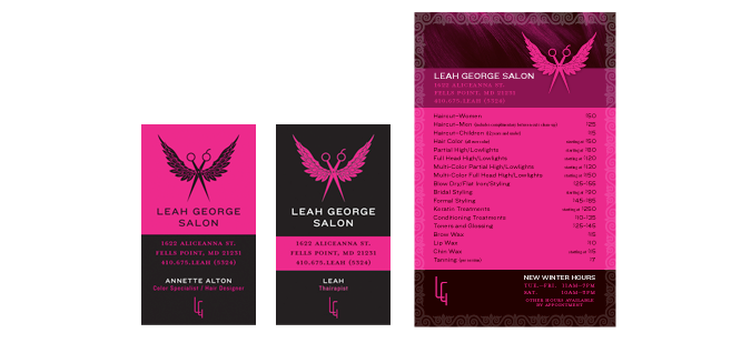 New identity and print for Baltimore hair salon. Client was looking for a new image to reach a younger, upscale client base. Logo, business cards, and services menu shown. Advertising and web presence are planned for the near future.