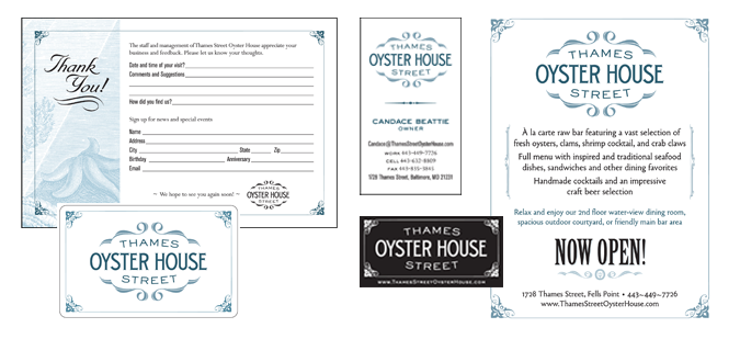 Collateral designs for Thames Street Oyster House. Shown here are the comment card, gift card, business card, sticker for carry-out boxes and bags, and an announcement advertisement for Baltimore Magazine.